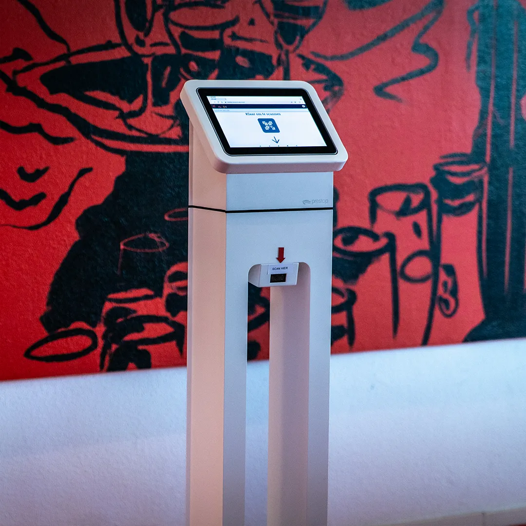 Because Prestop designs the kiosks in-house and has its own IT department, depending on the application, requirements and needs, we can expand your sign-in kiosk with options such as an ID card/passport reader, A4 printers, card dispensers, cameras, barcode scanner, receipt printer, motion sensor, privacy film, keyboard, wheels, card reader, RFID reader, and stickers.