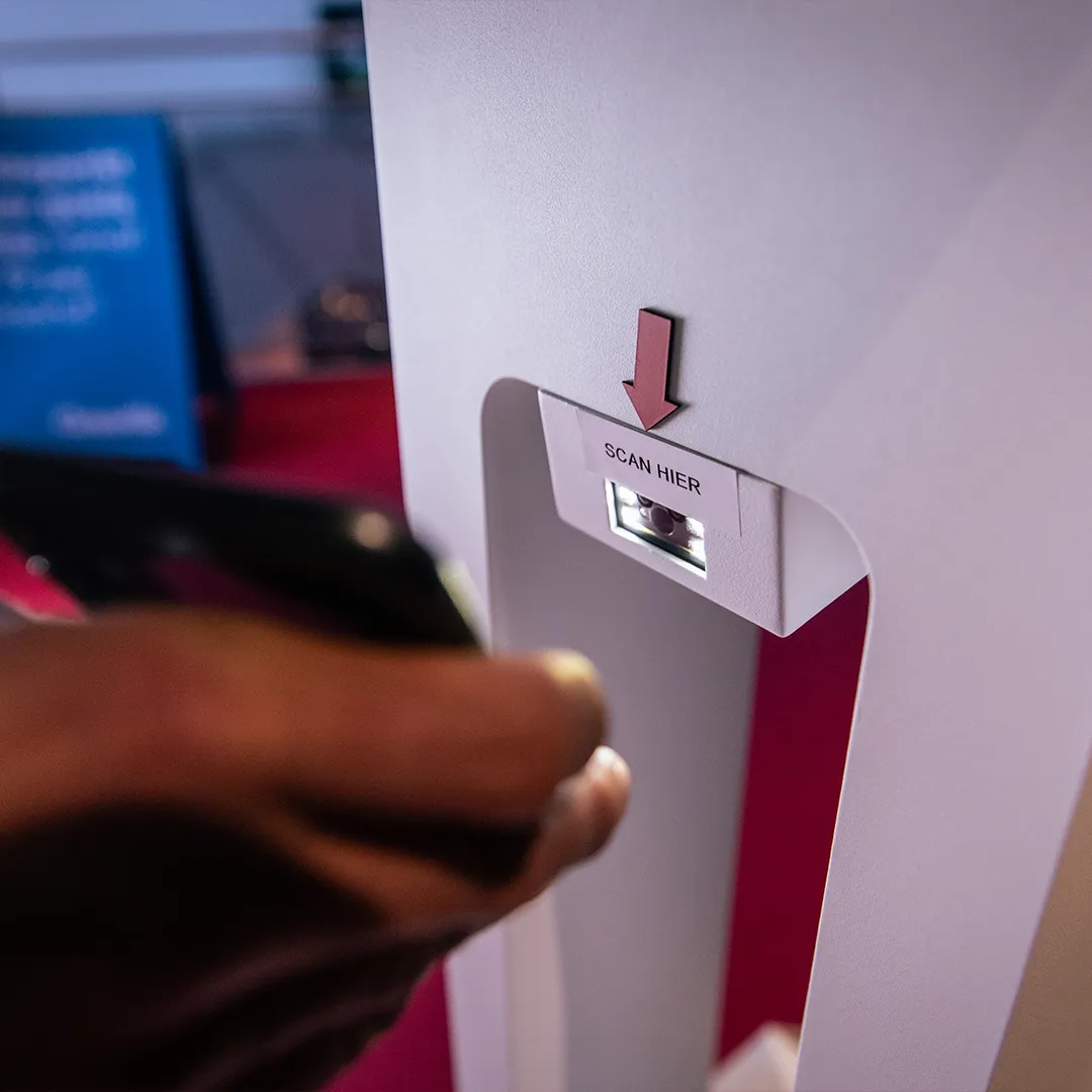 Visitors can scan their invitation or entrance ticket themselves via their QR or barcode, without any physical contact by an employee. The staff member sees the visitors' information on his/her own monitor and the visitor sees the required information on his/her own monitor.