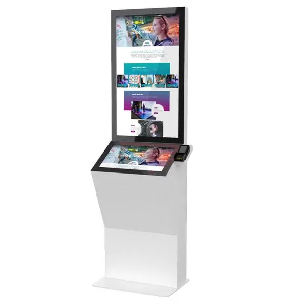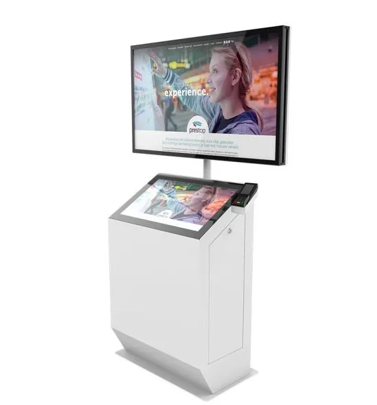 A variant of the Evolution kiosk, but with an additional top screen. Equipped with Full HD touchscreen and Full HD signage screen in portrait and pin holder.